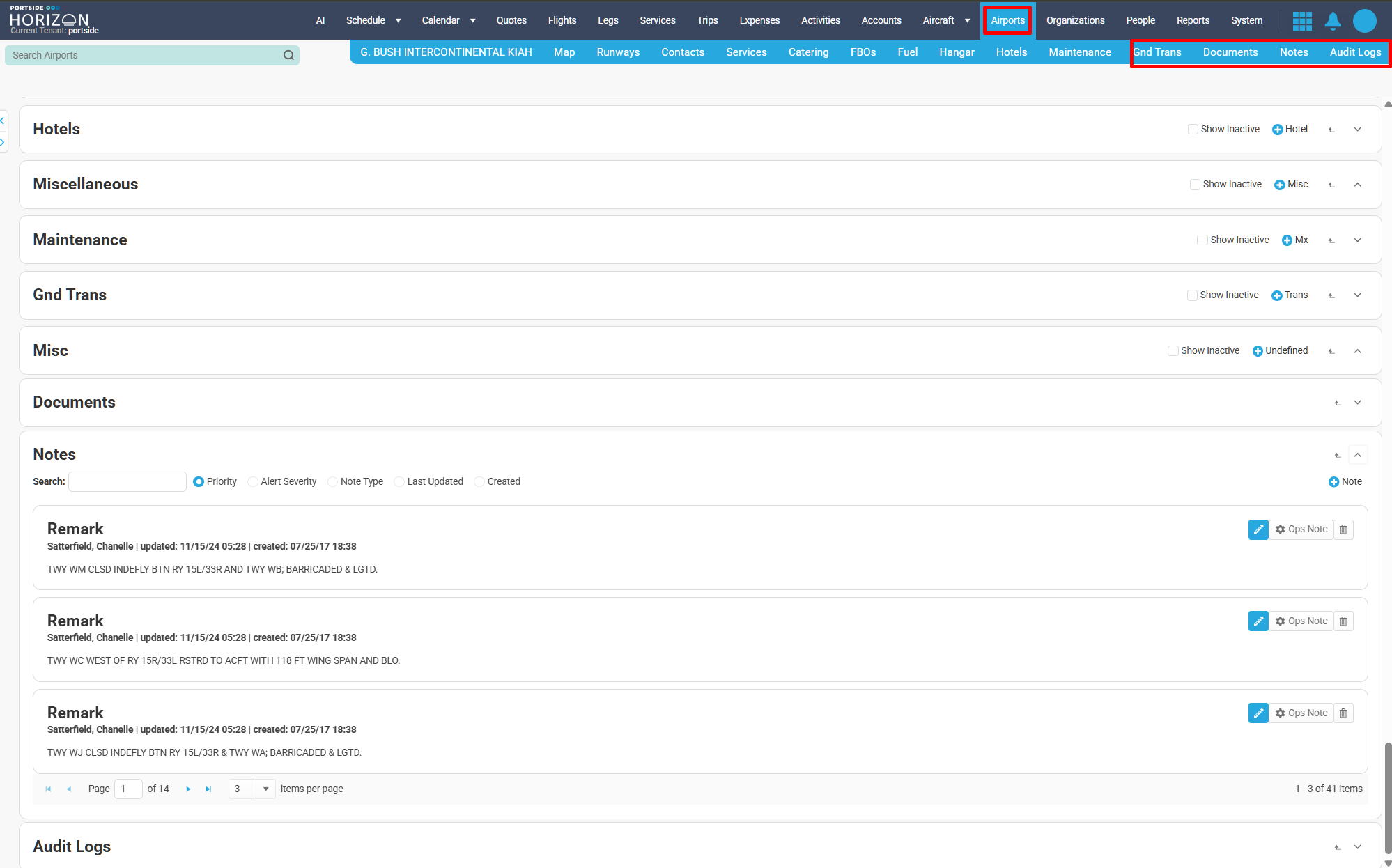 This article explains how to view and manage airport-specific data within the Horizon platform, including Hotels, Maintenance, Ground Transportation, Documents, Notes, and Audit Logs.