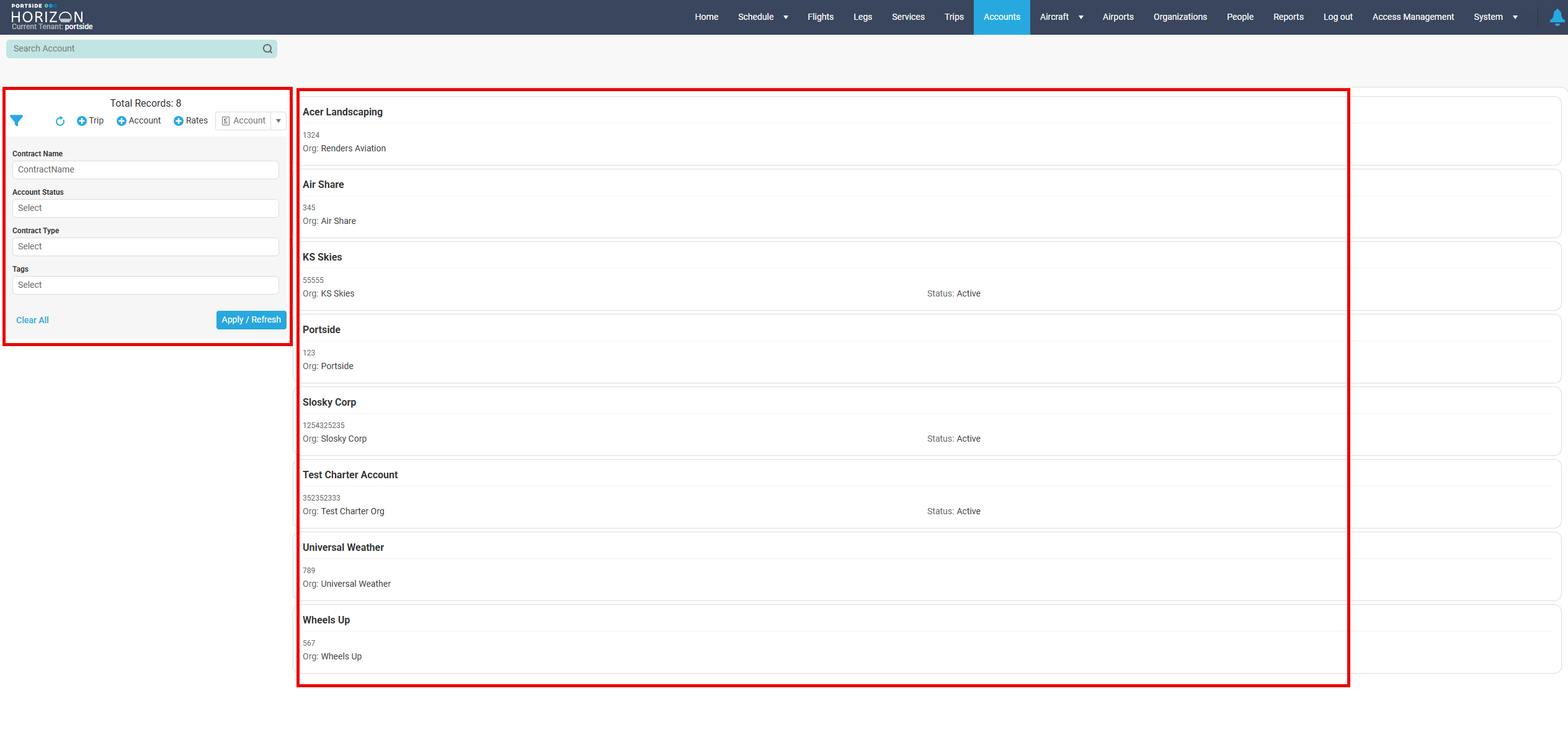 Accounts in Portside Horizon represent requestors. Those people or companies that can request lift, from you. They can be both outside entities or internal departments.