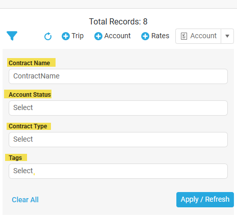 Contract Name: Allows a user to search by a contract name (if applicable), displaying accounts associated with filtered contract.