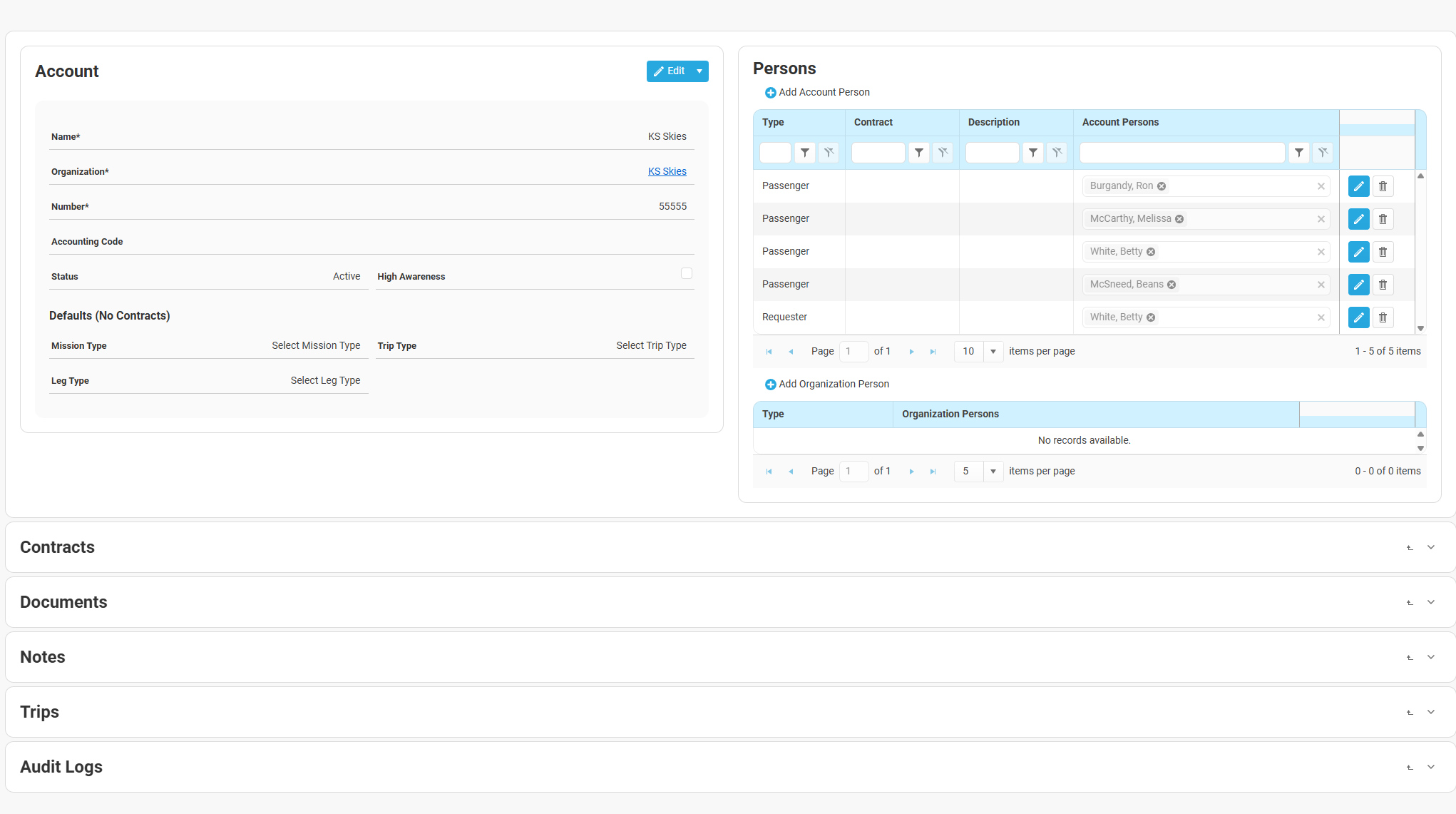 +Add Organization Person: Allows for the addition of people into an Organization, IF the account is associated with an Organization.