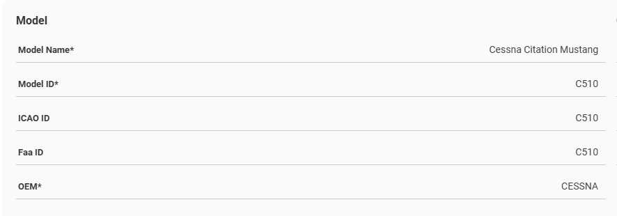 Model Name*: Text based description of the aircraft. This field is used to describe aircraft in longform in various areas including quoting. Typically found in client facing documents, quotes, etc..