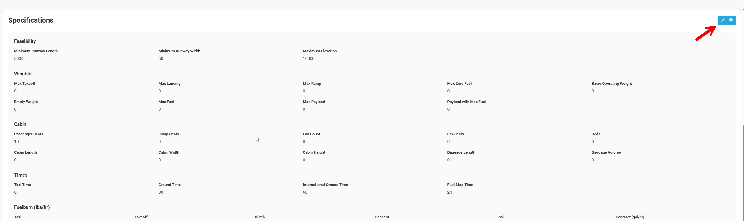 Within the "normal" Specifications window, this will apply to the aircraft model the user is currently in. Users must click "Edit" to make changes in this area.