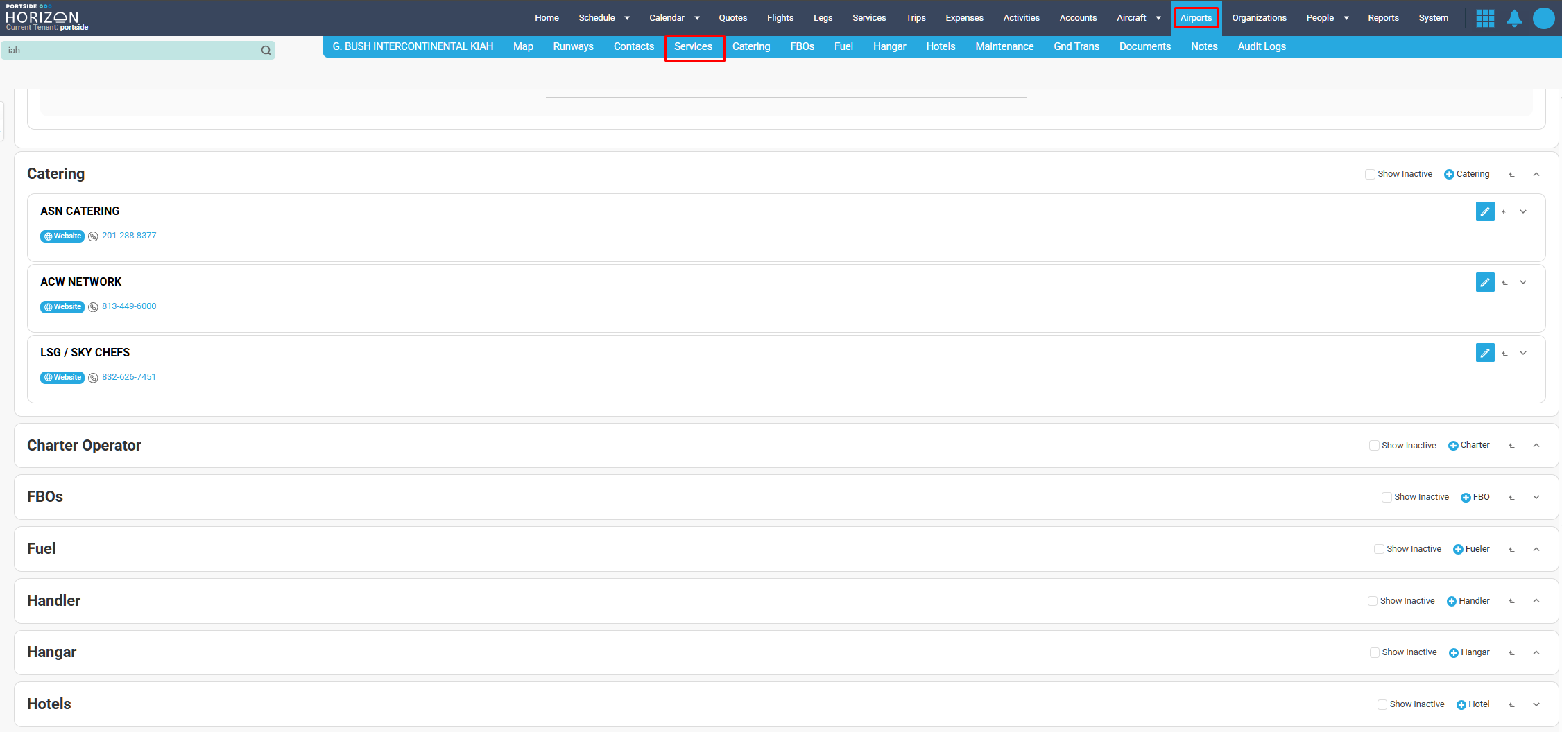 This article provides an overview of the Services tab within an Airport record (example shown: G. Bush Intercontinental – KIAH). The Services section centralizes vendor and facility information available at or near an airport—such as Catering, Charter, Cleaning, Fuel, Handlers, Hangars, and Hotels.