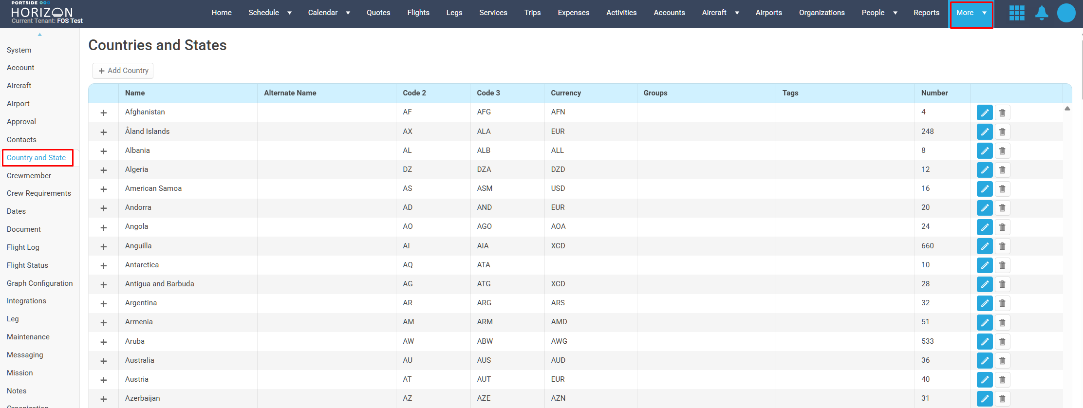 The Country and State Configuration section in Horizon centralizes the management of global location data, related classifications, and geographic groupings. Proper configuration ensures operational accuracy, compliance alignment, and consistent data usage across modules such as Accounts, Trips, and Flight Planning.