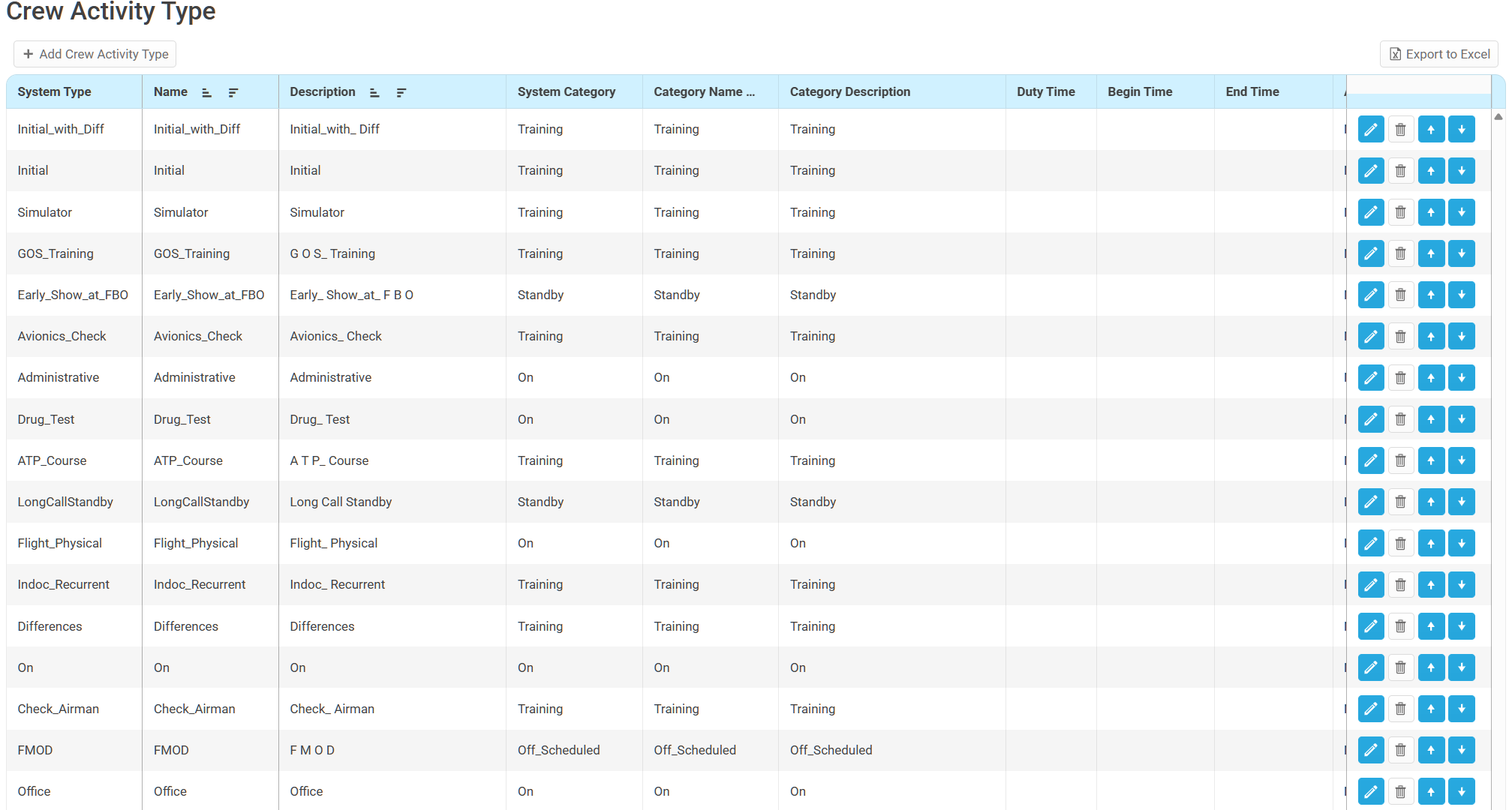 Crew Activity Types define specific tasks or duty periods performed by crew members within their rotation status. Examples include simulator sessions, check rides, physicals, and administrative duties.