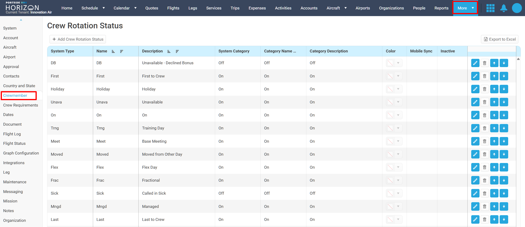 This article explains how to view, manage, and configure Crew Rotation Status and Crew Activity Types in Portside Horizon.