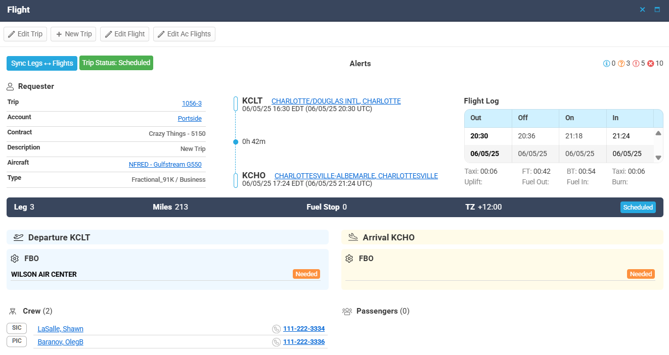 | Crew Section | Lists assigned pilots with position and contact details (e.g., PIC and SIC). |