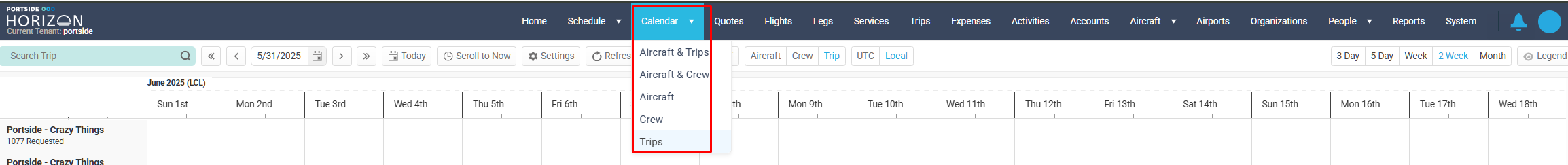 The Trips Calendar view in Horizon provides an overview of all active, scheduled, requested, and completed trips for the organization. It enables scheduling teams to visualize trip timelines, identify potential conflicts, and track trip progression from request through completion.