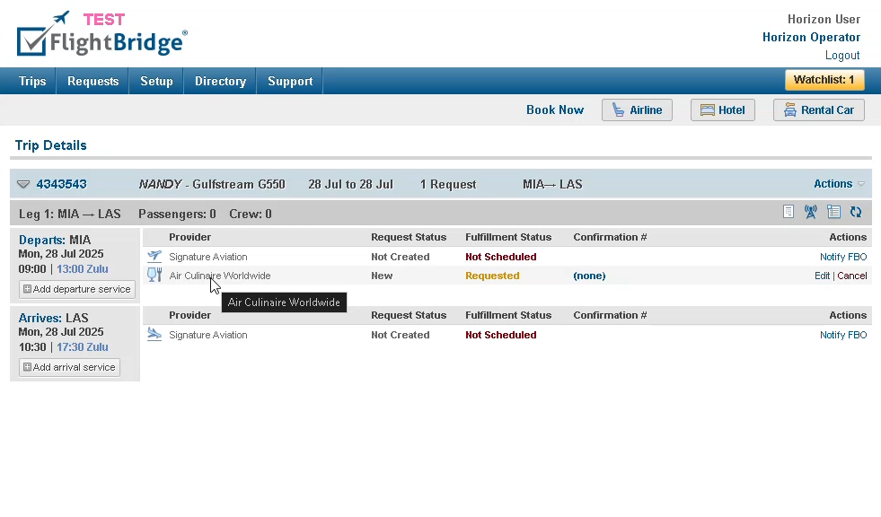 After ordering, return to the Trip > Flights > Services section in Horizon.