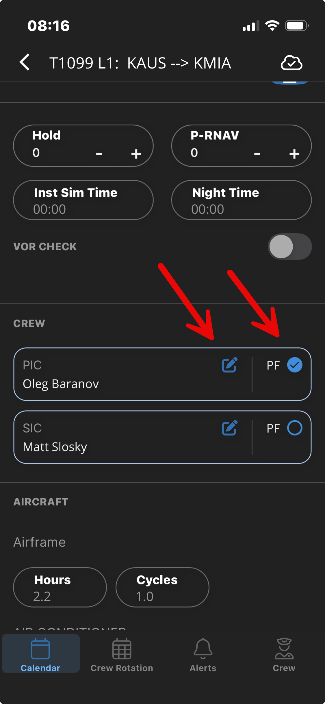 To streamline the flight log, we have updated the Pilot Flying (PF) selection to be its own action. This way, if no custom hours splits need to occur, the user does not need to go into the edit form to adjust anything.
