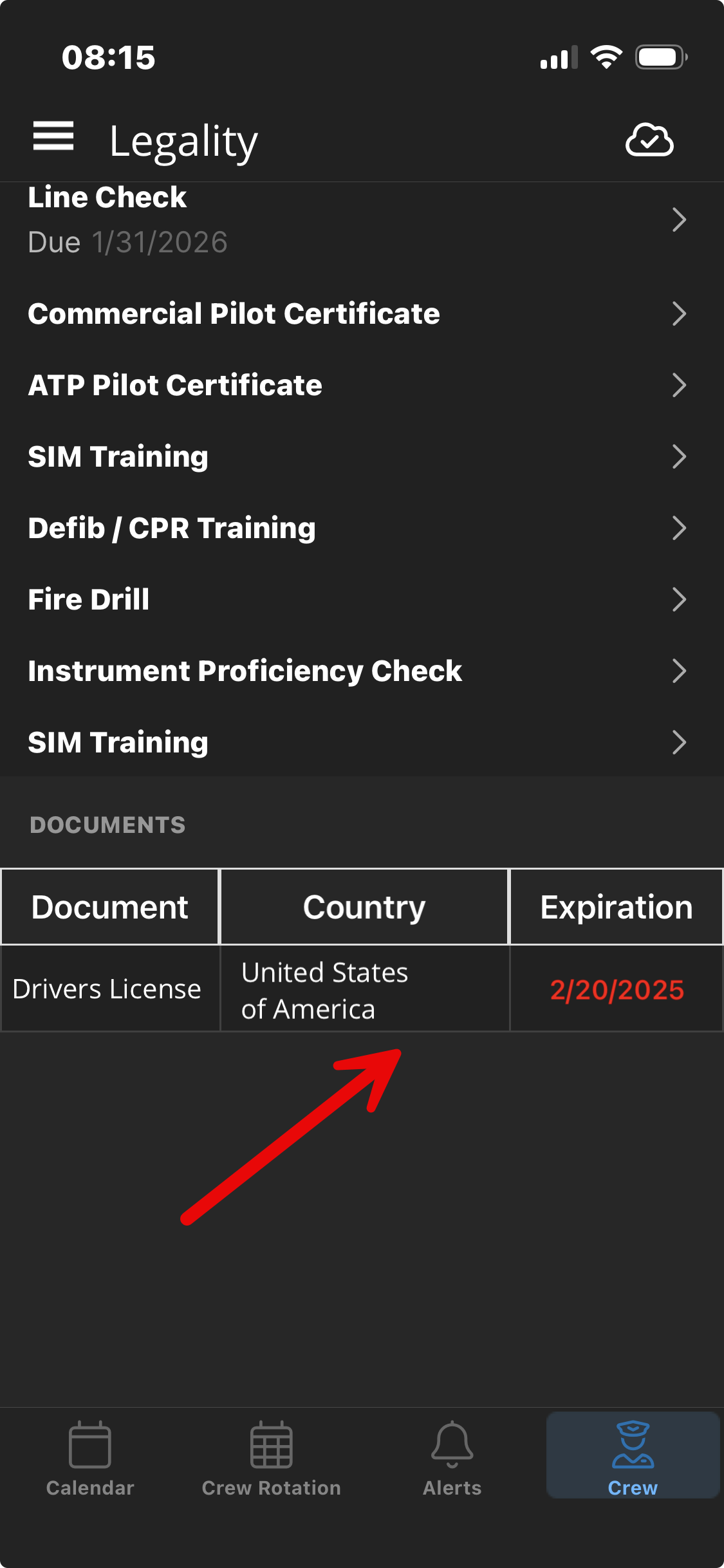 Crew members travel documents are now included on the Crew page with expiration dates highlighted when they are overdue.