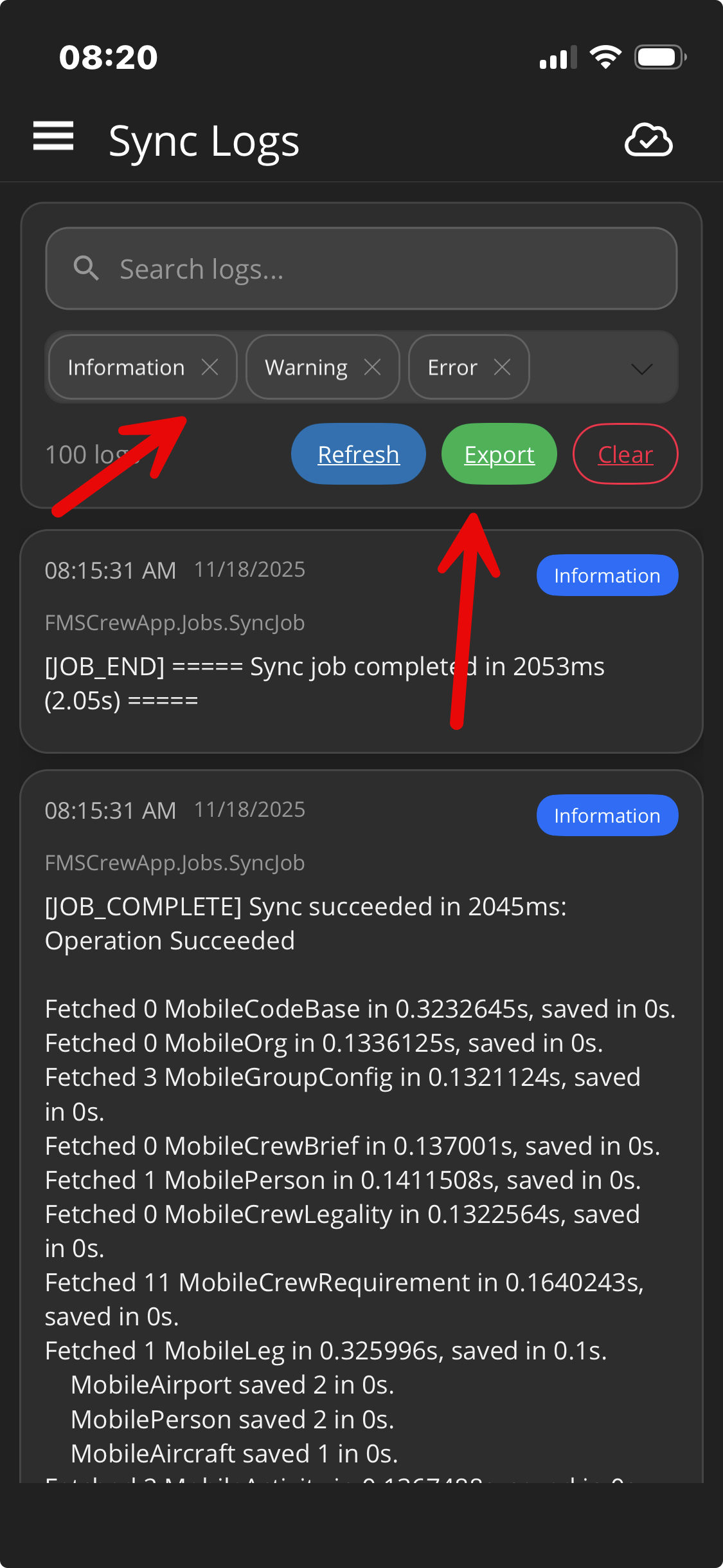 In the main navigation, there is now a section for Sync Logs. This will house the logs for each time the application syncs, and shows the log type (Information, Warning or Error). The user can easily filter by the type, and they can also export the results to easily send to the support team for further diagnosis.