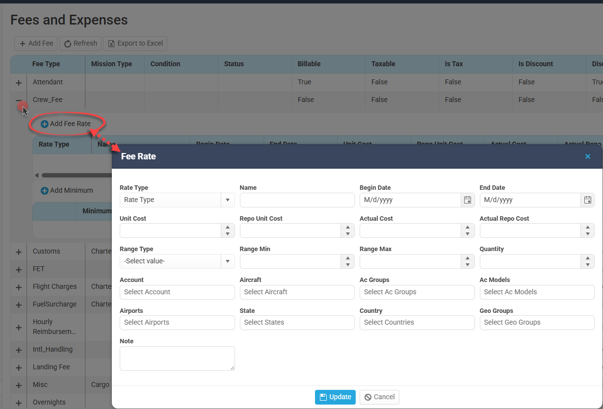 Begin and End dates | Defines the active period for this rate. The system will only apply this minimum rate if the flight's scheduled date falls within this range. |