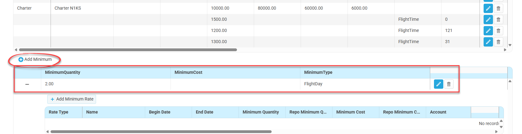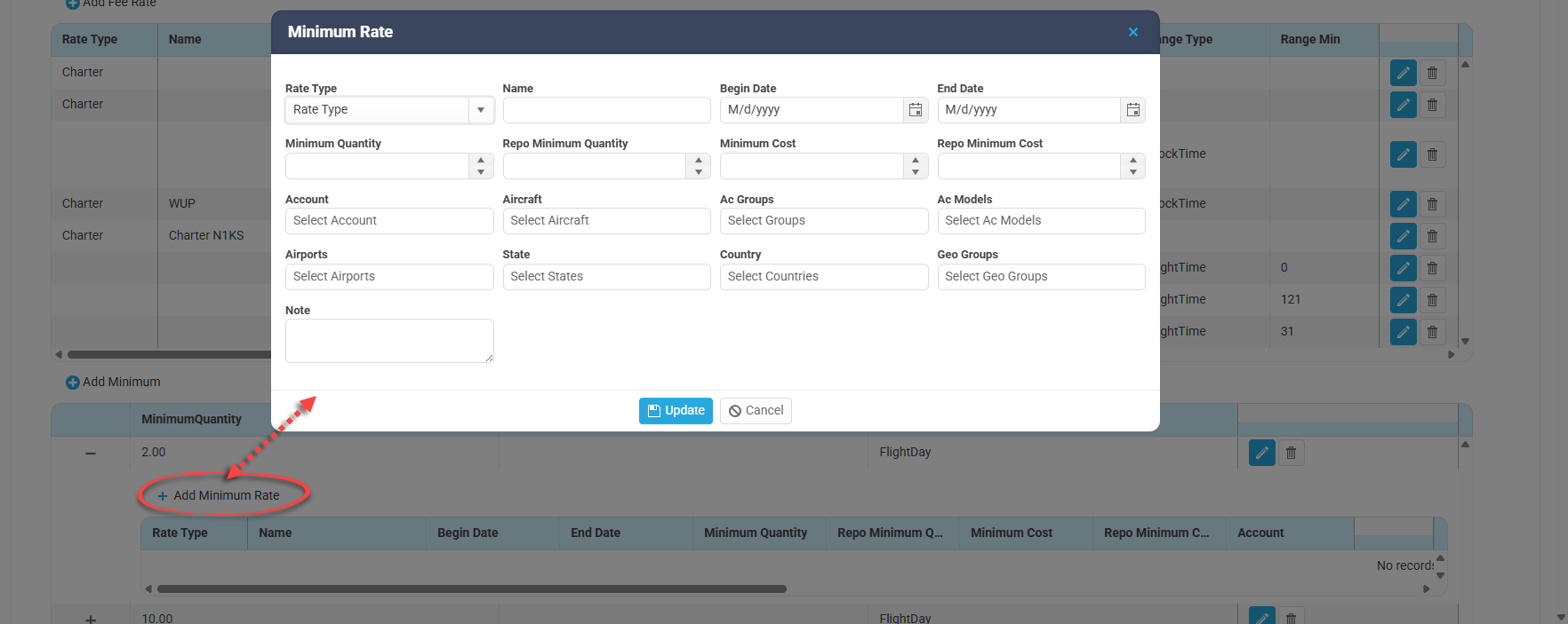 The Minimum Rate configuration defines a baseline cost that applies when the actual calculated flight cost falls below a certain threshold. It is often applied to ensure profitability on short or low-revenue flights.