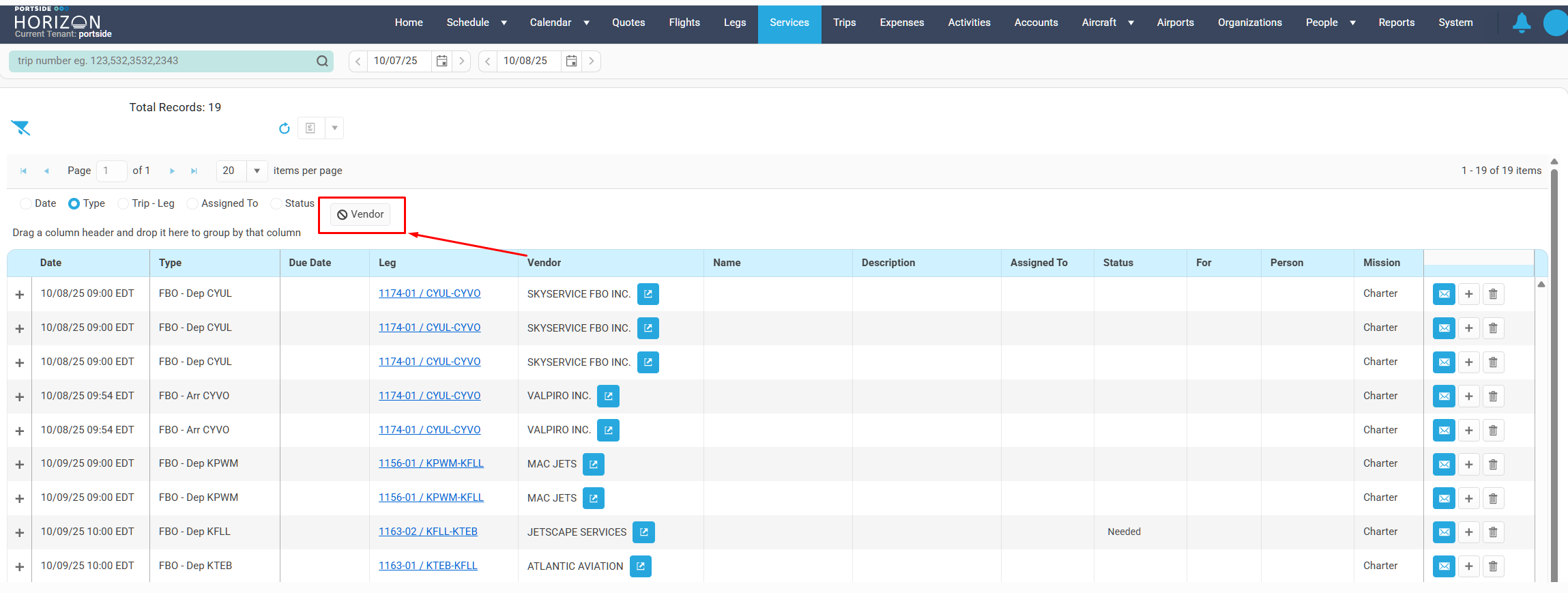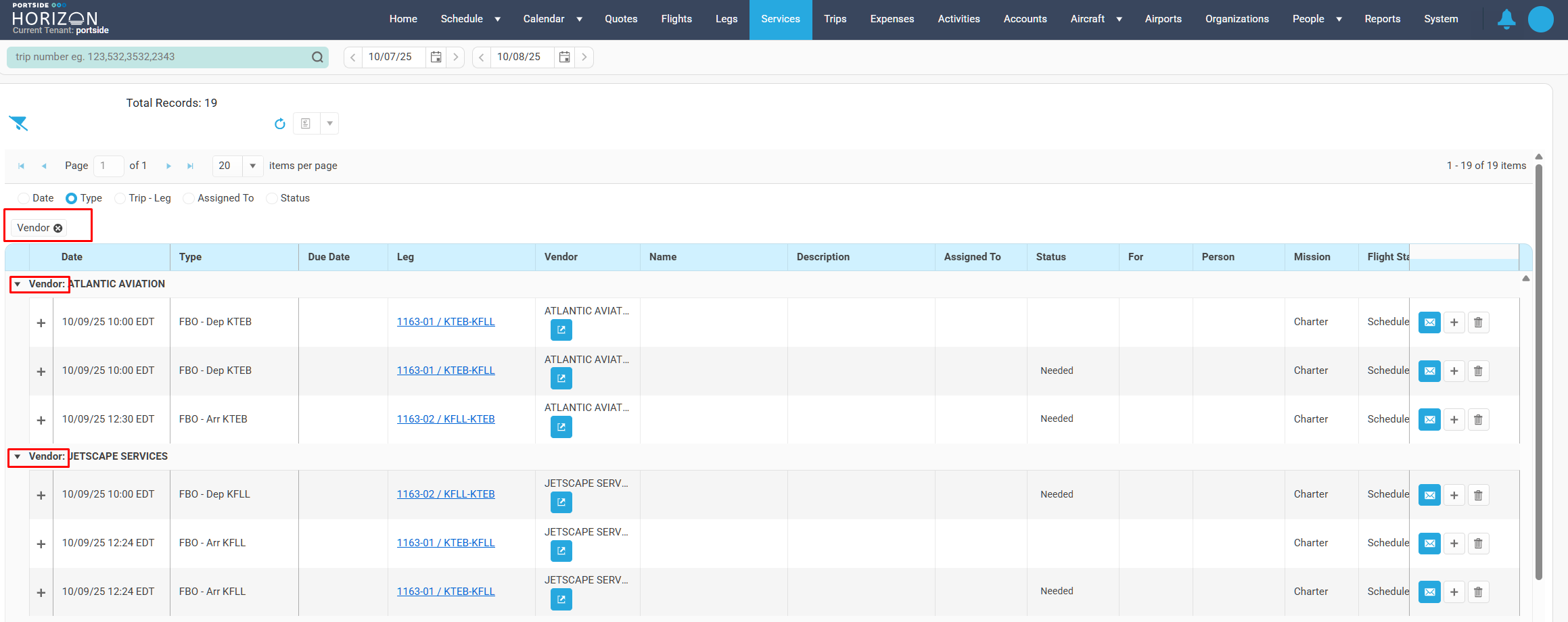Use Vendor grouping when reviewing multiple FBO or service providers for a trip period.