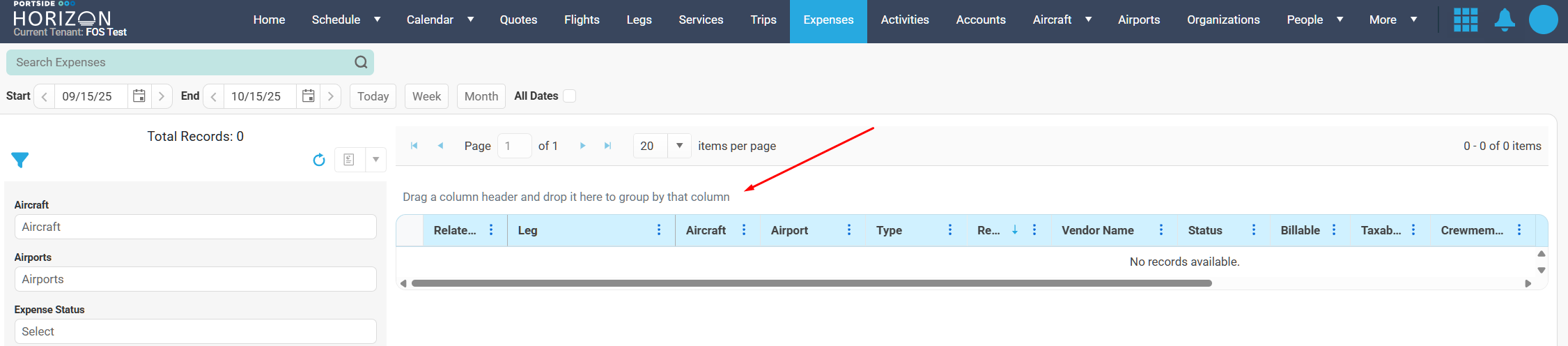 This article explains how to organize, group, and customize data columns in Horizon list views such as Expenses, Services, Trips, or Flights. The column grouping feature allows users to better analyze and sort records based on key data fields like Date, Type, Vendor, Status or Mission.