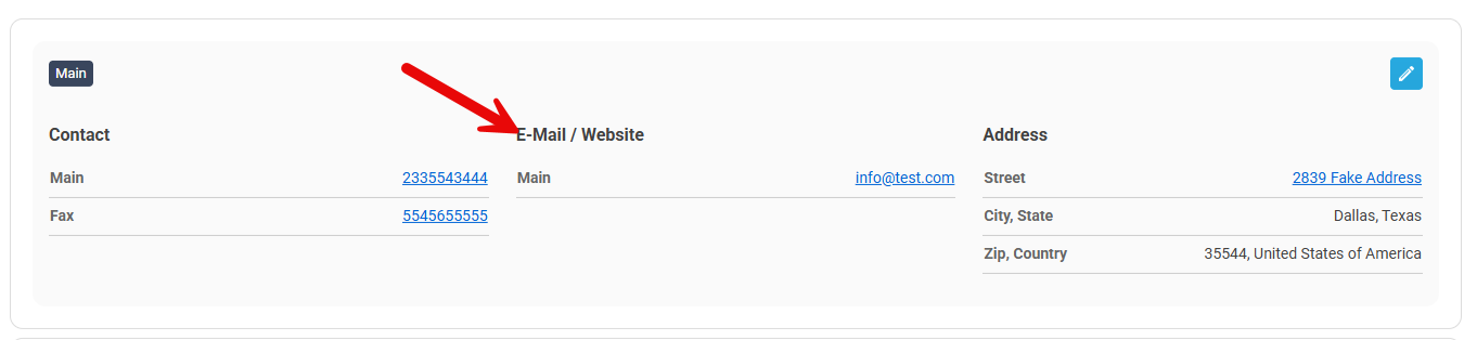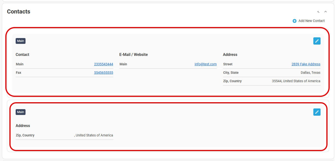 Contact Type, Name, and address information can be added on the left. You can also mark a contact card as "Primary".