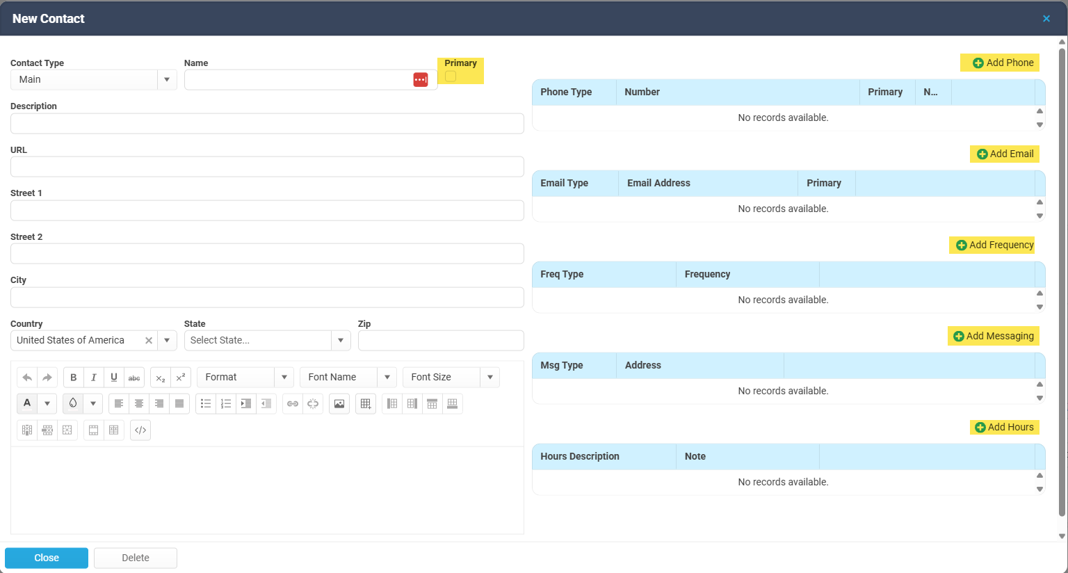 Various contact #'s, emails, Frequencies, and Hours can be added on the right.
