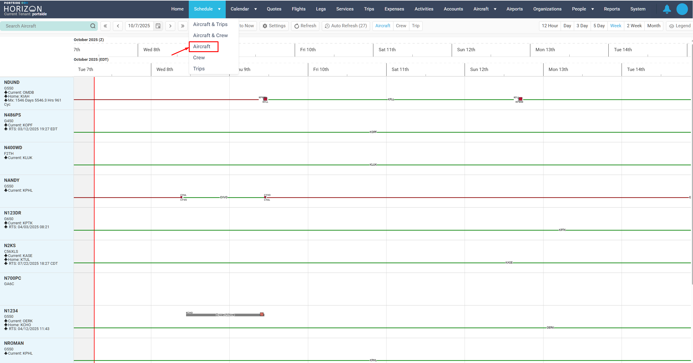 The Schedule menu in Horizon provides users with quick access to tools and views related to aircraft, crew, and trip scheduling. These options are designed to streamline flight operations by centralizing schedule management in one location.