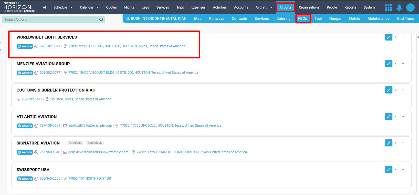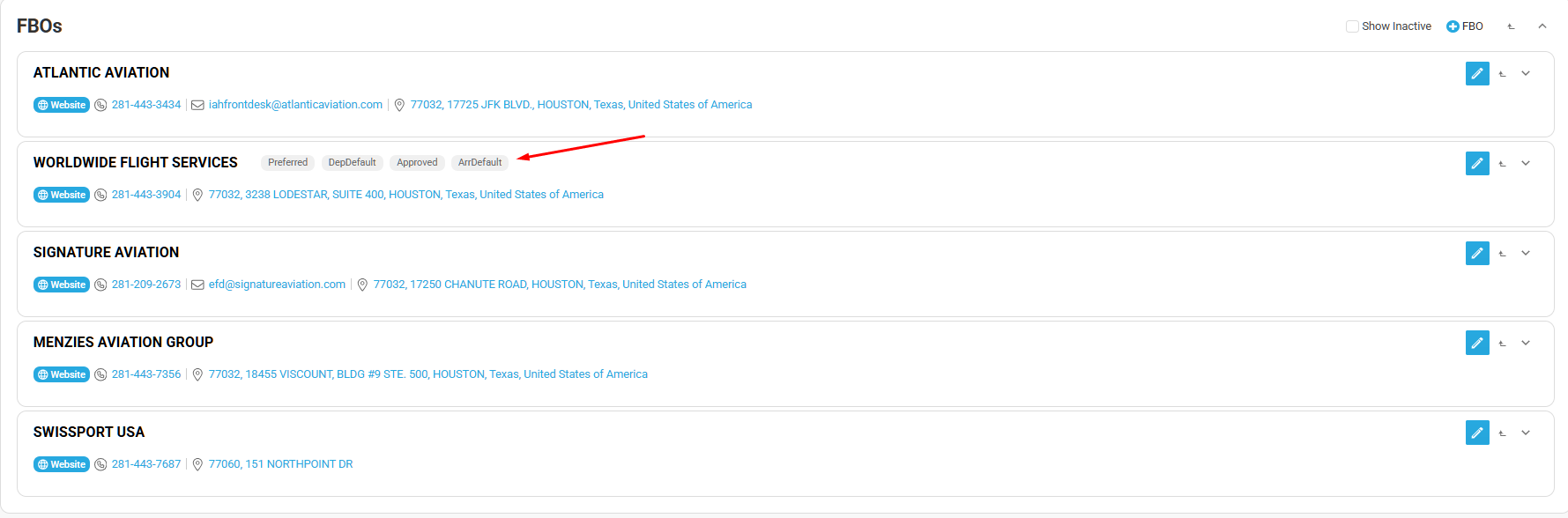 Test by viewing or creating a flight leg at that airport — the preferred FBO will pre-populate in relevant trip planning modules.
