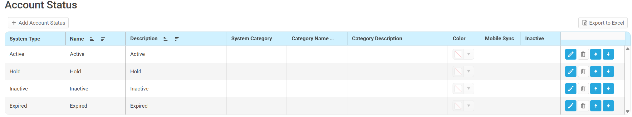 | System Type / Name / Description | Defines the account status type (e.g., Active, Hold, Inactive, Expired). |