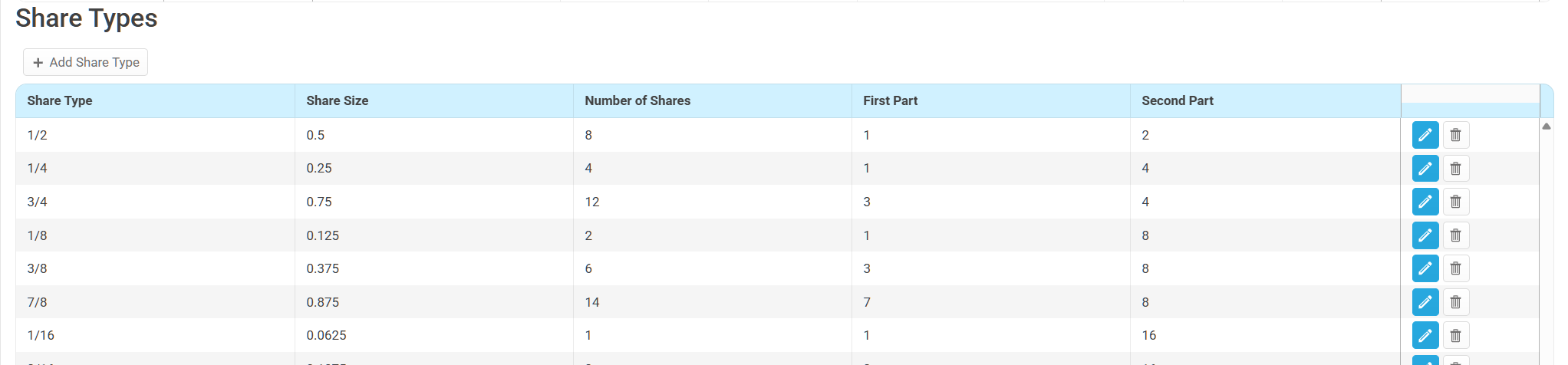 | Share Type | Fractional label for ownership (e.g., 1/2, 1/4, 3/4). |