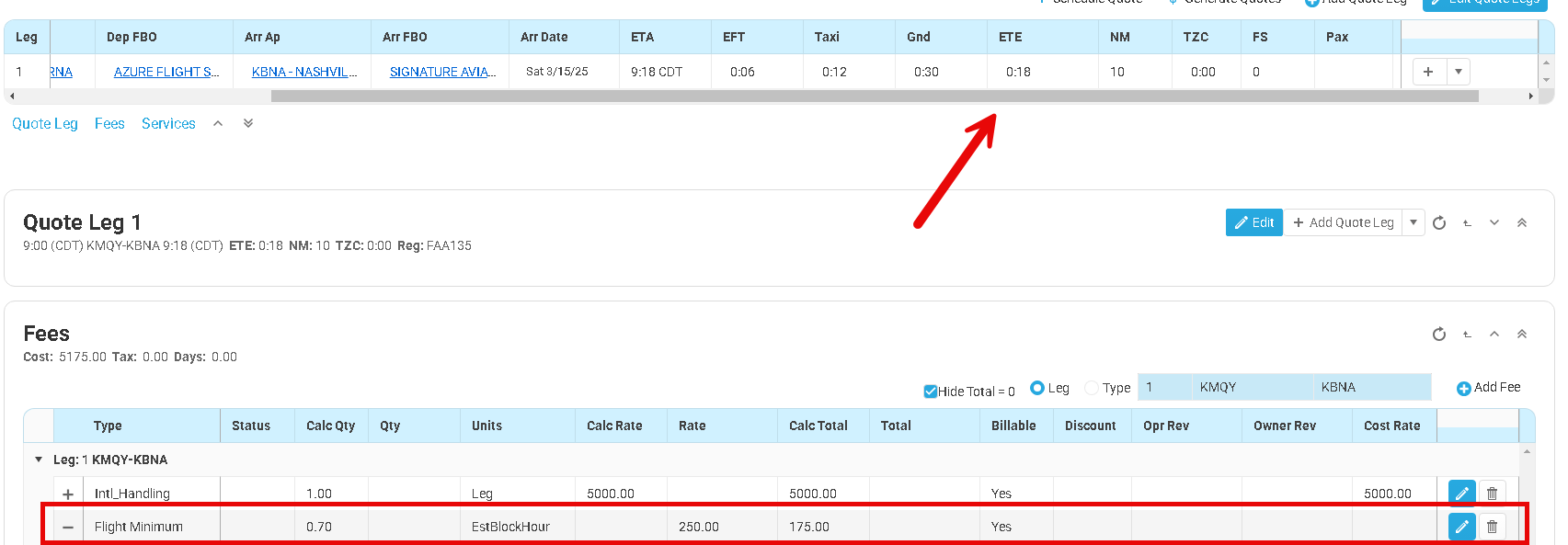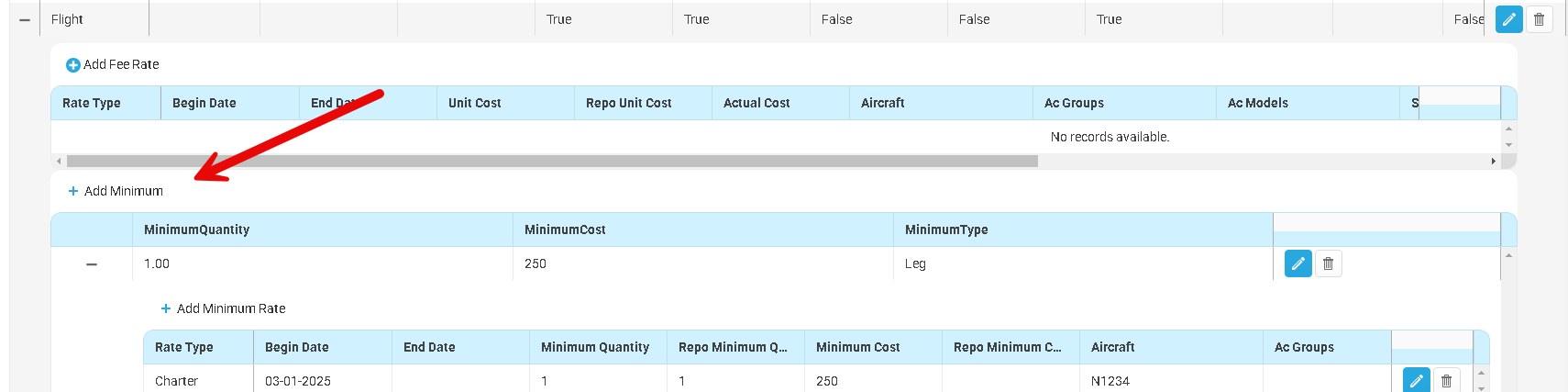 Fees can now have Leg Minimums added to them for charter quoting. Users are able to setup Minimum Quantity, Cost and Type (Leg is the one that is currently supported). Once a minimum is added, custom Minimum Rates can be applied by Tail Number, Aircraft Groups/Models, Airports, States or Countries.