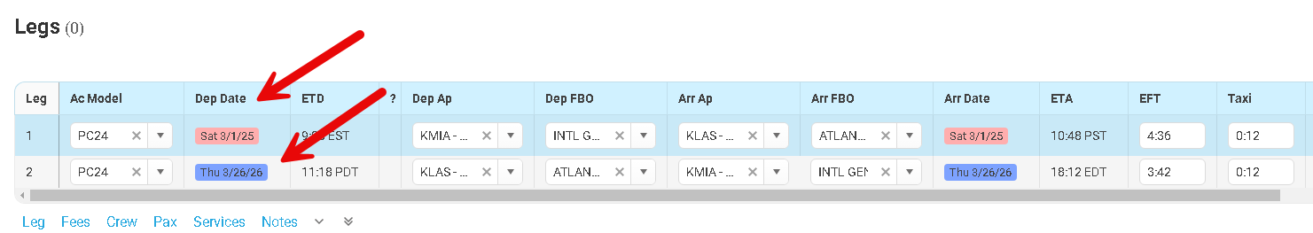 If a user enters a flight or leg on a trip that is in the past or one that is more than a year in the future, it will highlight the date to alert the user (red for legs in the past and blue for legs to far into the future).
