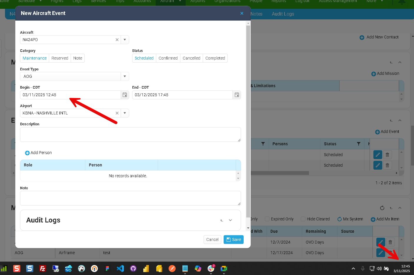 For maintenance events created from the aircraft profile, the start date now defaults to the current date/time.