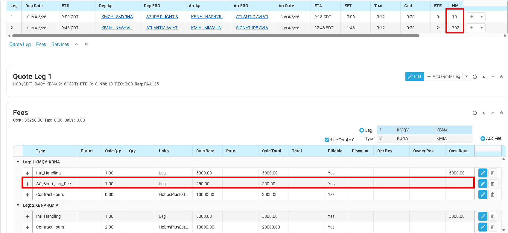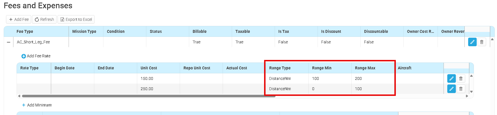 Additional conditions are available when adding fee rates to a fee in the system configuration to allow short leg fees based on distance and time.