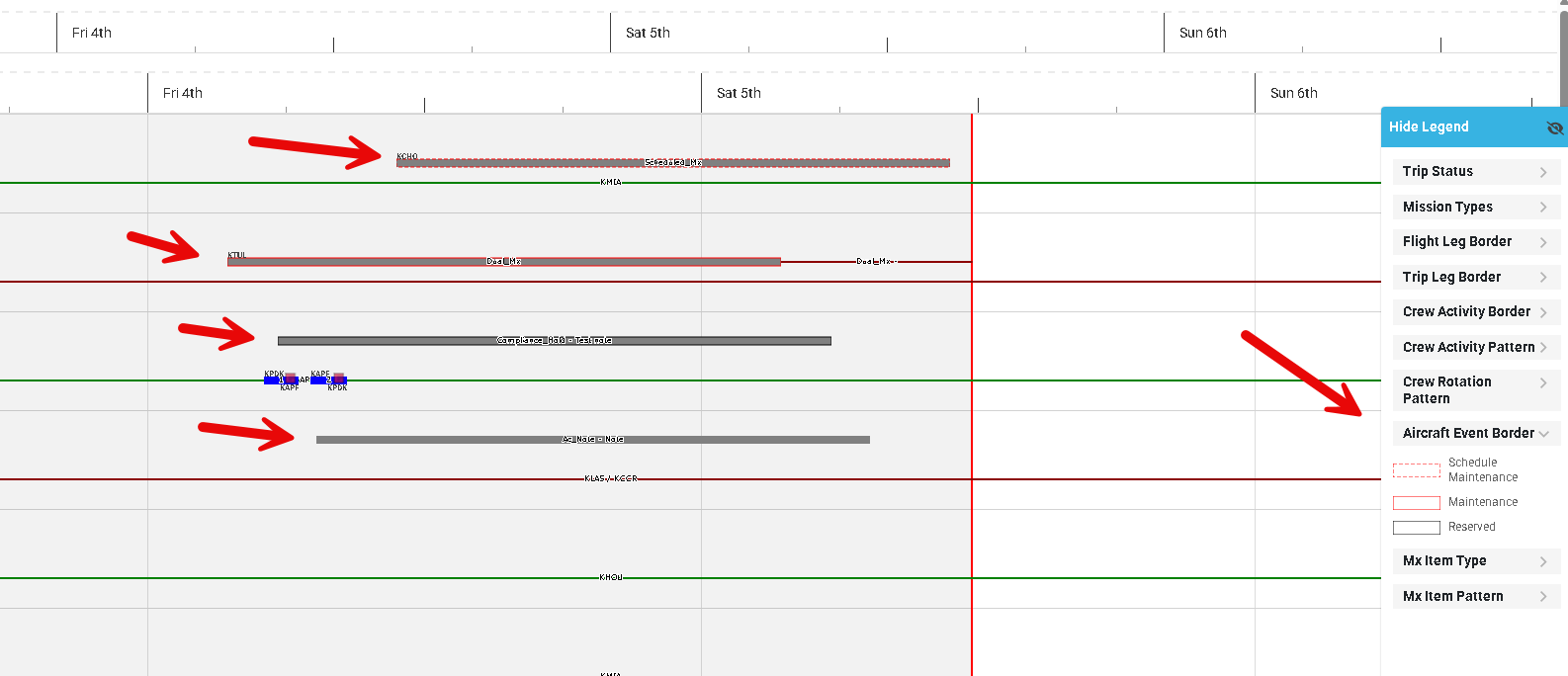 The type of aircraft event is no longer represented visually on the schedule based on a background pattern, but rather using the border. Scheduled maintenance events have a dashed red border, non-scheduled have a solid red border, reserved has a solid gray border, and notes do not have a border