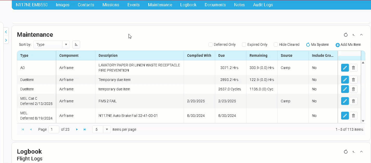 The sort functionality has been improved on the Maintenance table in the aircraft profile. The radio buttons previously used to sort are no longer there and there is a sort drop down where a user can select which column they want to sort on along with a button to change between sorting ascending or descending. In addition, new column has been added at the end of the table to show if the item includes grace or not