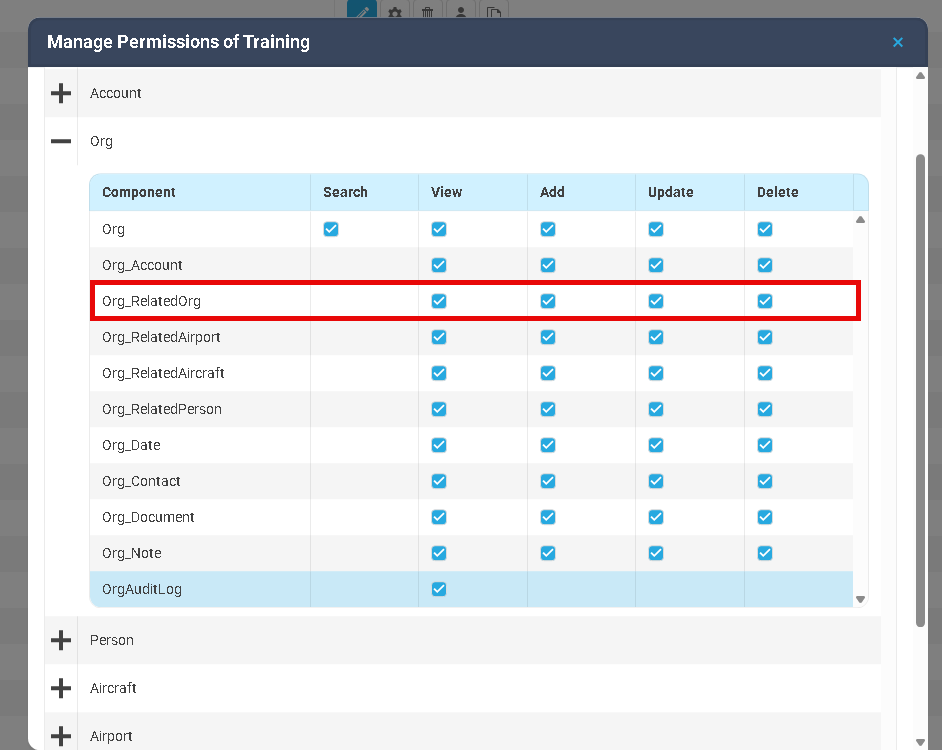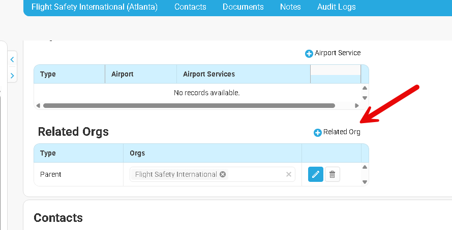 Within an organization record, there is a new section for Related Orgs is available to link other organizations to it. This is helpful when you have a parent organization (ex. FlightSafety International) and you want to relate other organizations to it (ex. each location that they have).
