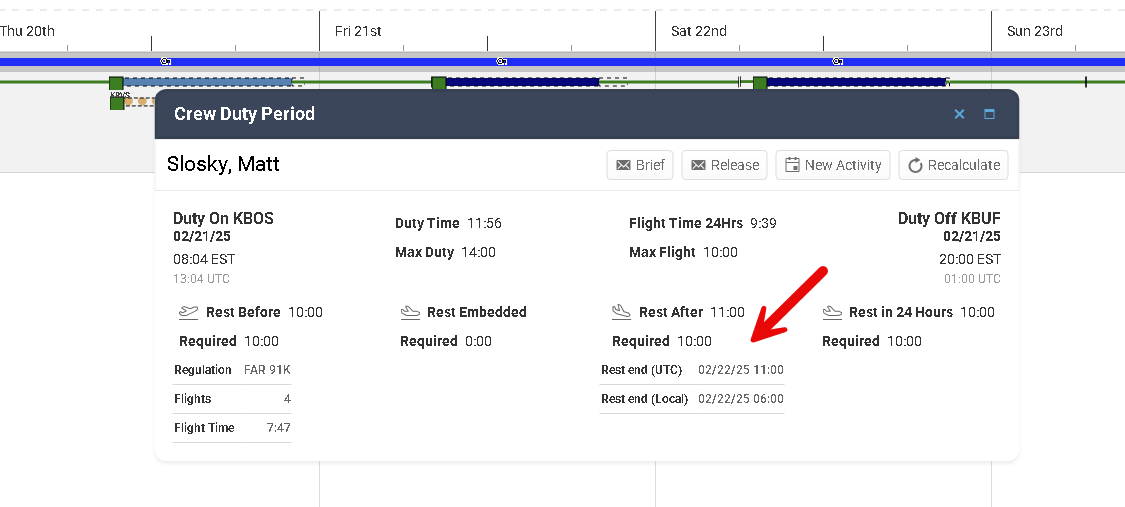 When viewing crew duty periods on the schedule, the minimum rest end time in UTC and local are displayed below the required rest.