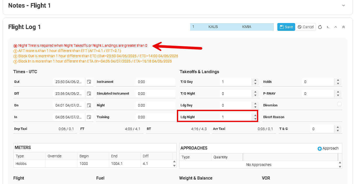 The flight log automatically allocates the takeoff and landing count to day or night as users enter the OFF and ON times based on whether they were during the day or night. If a night takeoff or landing is logged but there are no night hours, a warning will be displayed.