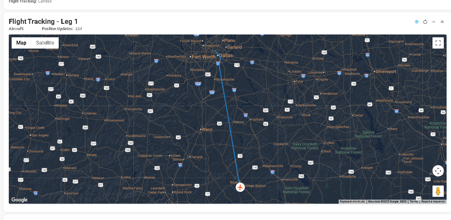 A flight tracking map has been added to a few areas of the system. When expanding the Flight Tracking section on a flight from within a trip, a map will be displayed with the flight path/position of the aircraft for that specific flight. In addition, a new fleet-wide map is accessible from the main Flight search page which shows the information for all flights enroute.